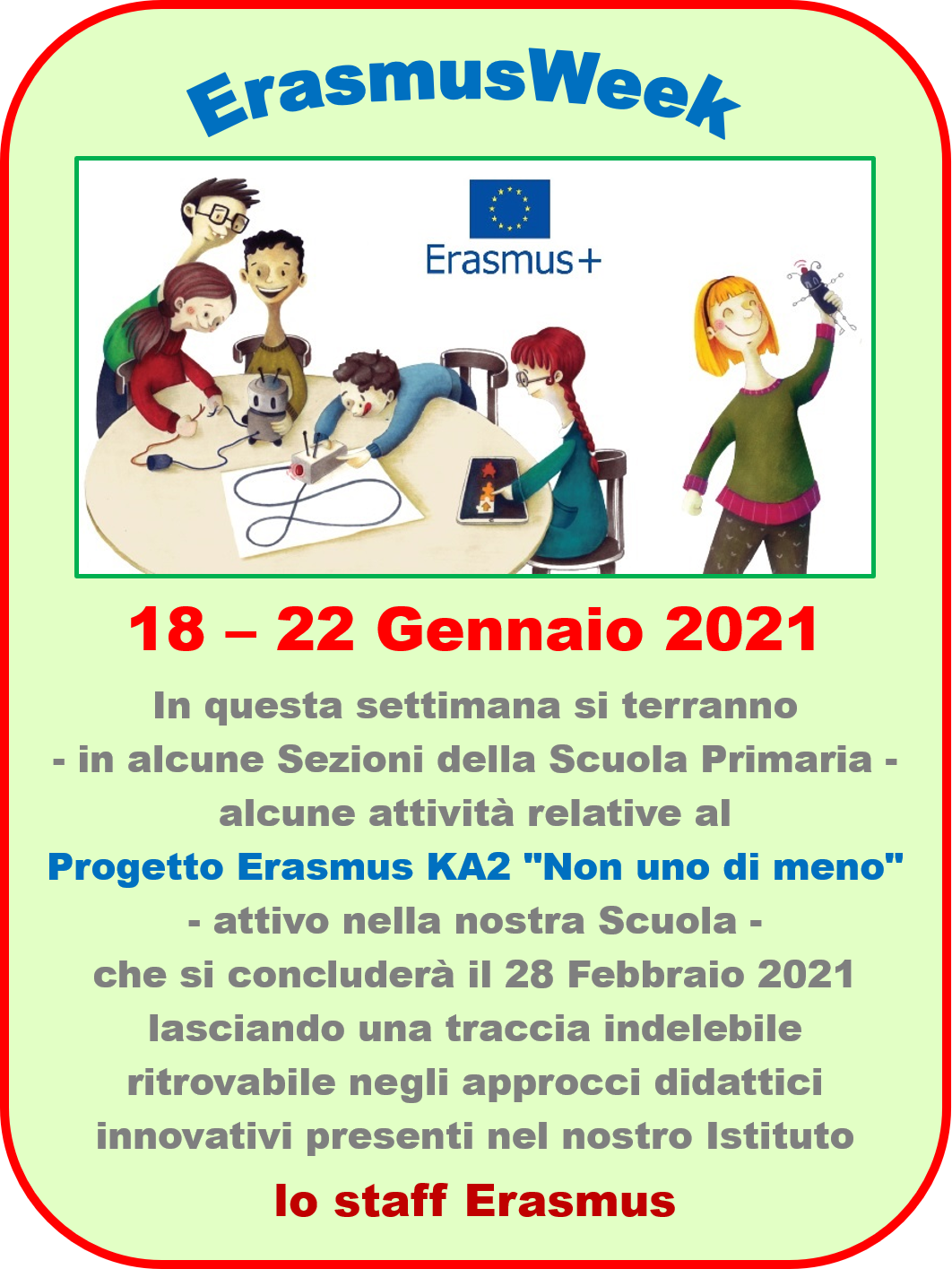 Si pubblica la comunicazione n. 105, con la quale si rende noto all’intera Comunità scolastica che dal 18 al 22 Gennaio 2021 si terranno, in alcune Sezioni della Scuola Primaria, attività relative al Progetto Erasmus “Non uno di meno“.
